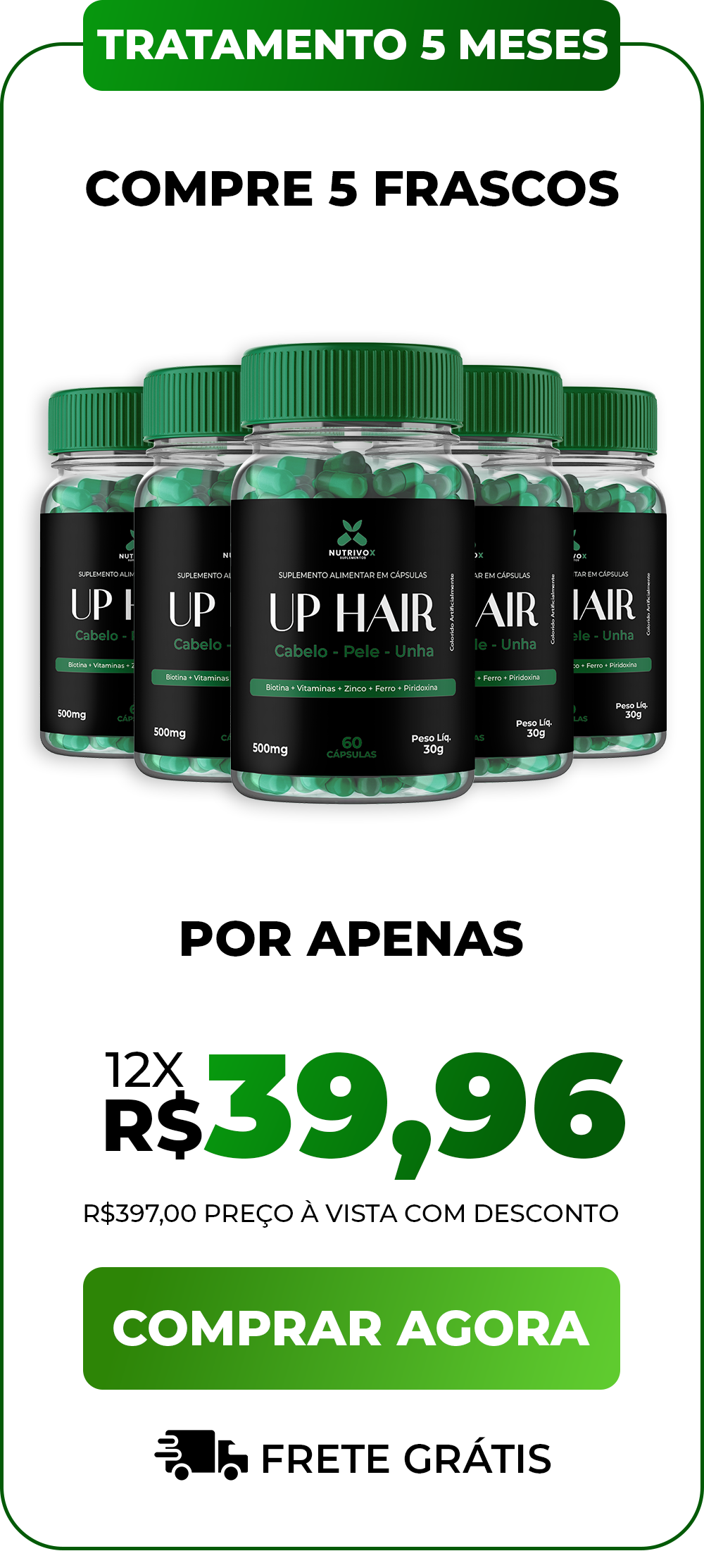 Marcas de farmácia usam doses baixas (ex.: 1000mcg de biotina) e cisteína comum, que o corpo não absorve. UP HAIR tem tecnologia patenteada: 5000mcg de biotina + cisteína quelada para resultados reais, não placebo.