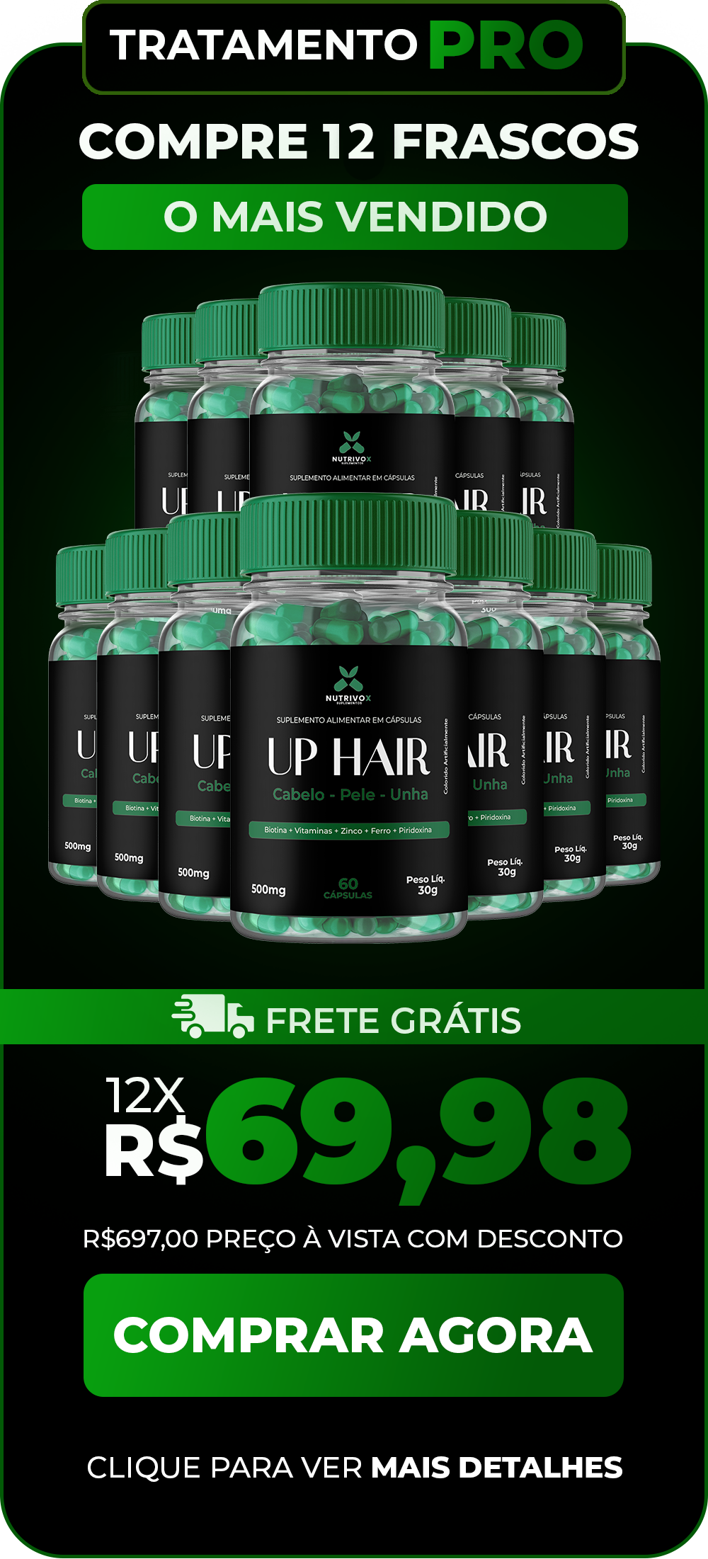 Em casos de alopecia androgenética estágio 3-4, UP HAIR reduz a progressão em 68% (dados de 2024). Combinado com minoxidil, os resultados são ainda melhores. Veja o caso do Marcos na seção de depoimentos!